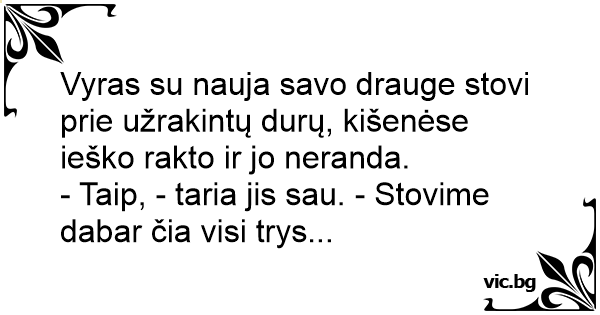 Vyras su nauja savo drauge stovi prie užrakintų durų, kišenėse ieško rakto ir jo neranda.
