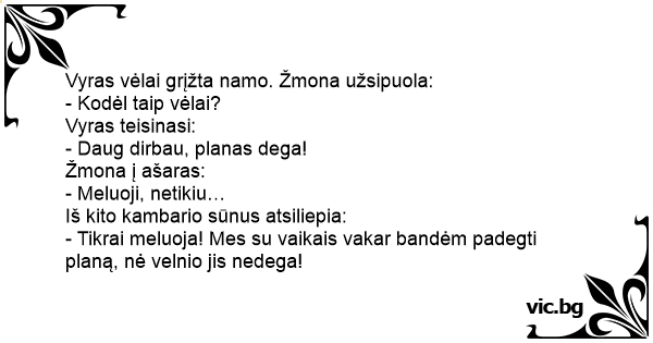 - Tikrai meluoja! Mes su vaikais vakar bandėm padegti planą, nė velnio jis nedega!