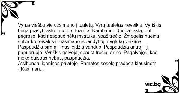 Atsibunda ligoninės palatoje. Pamatęs seselę pradeda klausinėti: