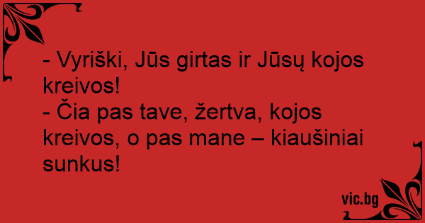 - Čia pas tave, žertva, kojos kreivos, o pas mane – kiaušiniai sunkus!