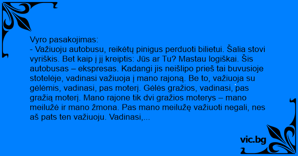 - Važiuoju autobusu, reikėtų pinigus perduoti bilietui. Šalia stovi vyriškis. Bet kaip į jį kreiptis: Jūs ar Tu? Mastau logiškai. Šis autobusas – ekspresas. Kadangi jis neišlipo prieš tai buvusioje stotelėje, vadinasi važiuoja į mano rajoną. Be to, važiuoja su gėlėmis, vadinasi, pas moterį. Gėlės gražios, vadinasi, pas gražią moterį. Mano rajone tik dvi gražios moterys – mano meilužė ir mano žmona. Pas mano meilužę važiuoti negali, nes aš pats ten važiuoju. Vadinasi, važiuoja pas mano žmoną. Mano žmona turi du meilužius – Petrą ir Vasią. Petras dabar komandiruotėje.