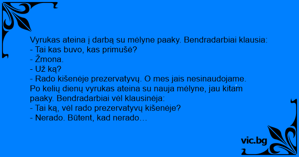 Po kelių dienų vyrukas ateina su nauja mėlyne, jau kitam paaky. Bendradarbiai vėl klausinėja: