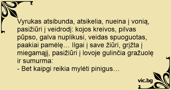 Vyrukas atsibunda, atsikelia, nueina į vonią, pasižiūri į veidrodį: kojos kreivos, pilvas pūpso, galva nuplikusi, veidas spuoguotas, paakiai pamėlę… Ilgai į save žiūri, grįžta į miegamąjį, pasižiūri į lovoje gulinčia gražuolę ir sumurma: