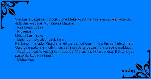Vyrukas atvažiuoja motociklu prie Meksikos-Amerikos sienos. Rankose du didžiuliai krepšiai. Muitininkas klausia: