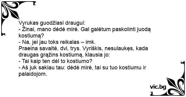 - Žinai, mano dėdė mirė. Gal galėtum paskolinti juodą kostiumą?