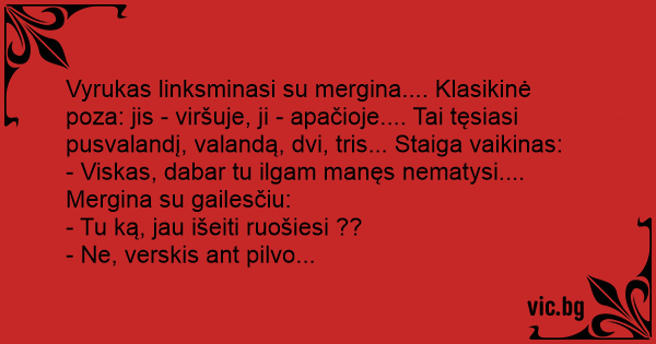 Vyrukas linksminasi su mergina.... Klasikinė poza: jis - viršuje, ji - apačioje.... Tai tęsiasi pusvalandį, valandą, dvi, tris... Staiga vaikinas: