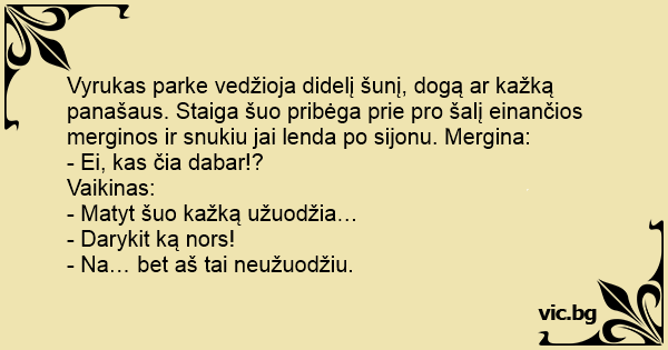 Vyrukas parke vedžioja didelį šunį, dogą ar kažką panašaus. Staiga šuo pribėga prie pro šalį einančios merginos ir snukiu jai lenda po sijonu. Mergina: