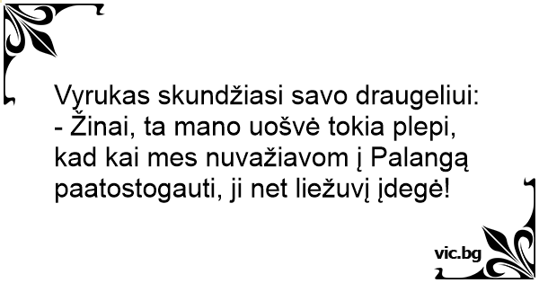 - Žinai, ta mano uošvė tokia plepi, kad kai mes nuvažiavom į Palangą paatostogauti, ji net liežuvį įdegė!