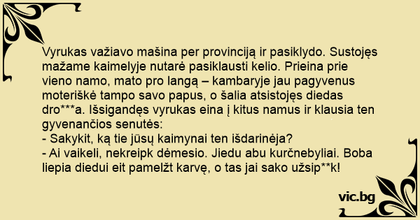 Vyrukas važiavo mašina per provinciją ir pasiklydo. Sustojęs mažame kaimelyje nutarė pasiklausti kelio. Prieina prie vieno namo, mato pro langą – kambaryje jau pagyvenus moteriškė tampo savo papus, o šalia atsistojęs diedas dro***a. Išsigandęs vyrukas eina į kitus namus ir klausia ten gyvenančios senutės: