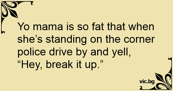 Yo mama is so fат that when she’s standing on the corner police drive by and yell, “Hey, break it up.”