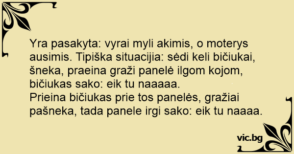 Yra pasakyta: vyrai myli akimis, o moterys ausimis. Tipiška situacijia: sėdi keli bičiukai, šneka, praeina graži panelė ilgom kojom, bičiukas sako: eik tu naaaaa.