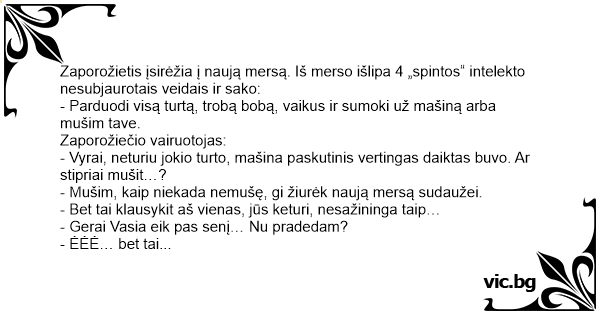 Zaporožietis įsirėžia į naują mersą. Iš merso išlipa 4 „spintos“ intelekto nesubjaurotais veidais ir sako: