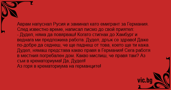 - Дудел, няма да повярваш! Когато стигнах до Хамбург и веднага ми предложиха работа. Дудел, дръж се здраво! Даже по-добре да седнеш, че ще паднеш от това, което ще ти кажа. Дудел, нямаш представа какво правя в Германия! Сега работя в местния погребален дом. Какво мислиш, че правя там? Аз съм в крематориума! Да, Дудел!