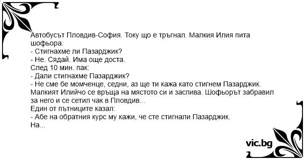 Автобусът Пловдив-София. Току що е тръгнал. Малкия Илия пита шофьора: