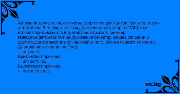 Автомагистрала, по нея с висока скорост се движат три правителствени автомобила.В първият се вози държавният секретар на САЩ, във вторият британският, а в третият българският премиер.