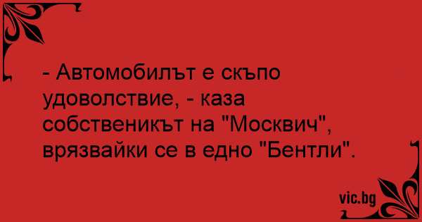 - Автомобилът е скъпо удоволствие, - каза собственикът на "Москвич", врязвайки се в едно "Бентли".