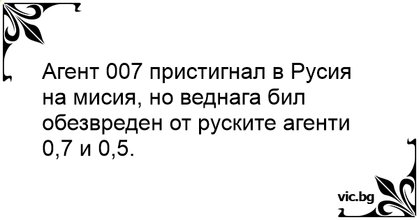 Агент 007 пристигнал в Русия на мисия, но веднага бил обезвреден от руските агенти 0,7 и 0,5.