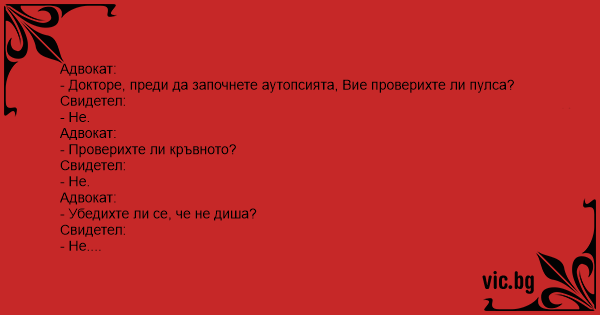 Advokaten: - Doktorn, innan ni gjorde obduktionen, letade ni efter någon puls? Obducenten: - Nej. - Kollade ni blodtrycket? - Nej. - Kollade ni om patienten andades? - Nej. - Så ni menar att...