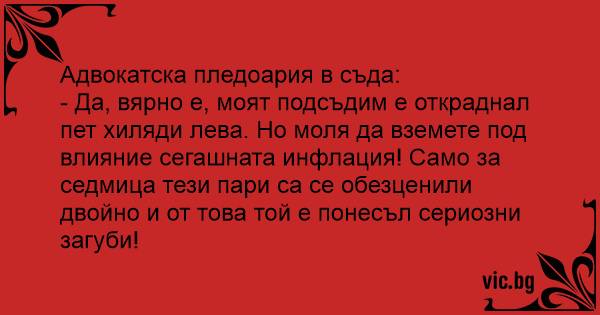 - Да, вярно е, моят подсъдим е откраднал пет хиляди лева. Но моля да вземете под влияние сегашната инфлация! Само за седмица тези пари са се обезценили двойно и от това той е понесъл сериозни загуби!