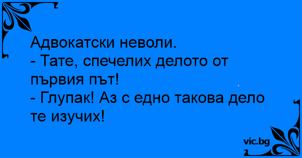 Ein junger Rechtsanwalt besucht seinem Vater, der auch Rechtsanwalt ist. Der Sohn berichtet stolz: "Stell dir vor Vater, den Erbschaftsprozess, den du mir übergeben hast, habe ich gewonnen." "Du...