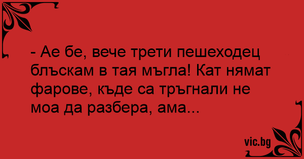 - Ае бе, вече трети пешеходец блъскам в тая мъгла! Кат нямат фарове, къде са тръгнали не моа да разбера, ама...