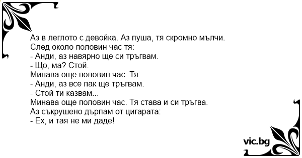 Аз в леглото с девойка. Аз пуша, тя скромно мълчи.