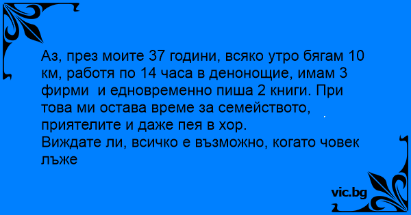 Аз, през моите 37 години, всяко утро бягам 10 км, работя по 14 часа в денонощие, имам 3 фирми и едновременно пиша 2 книги. При това ми остава време за семейството, приятелите и даже пея в хор.
