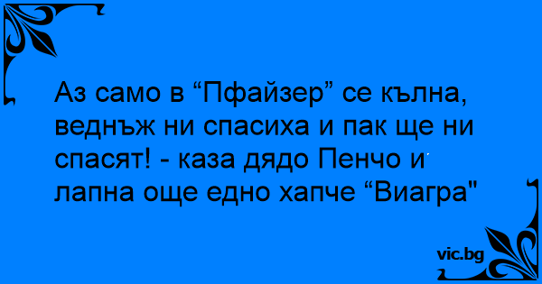 Аз само в “Пфайзер” се кълна, веднъж ни спасиха и пак ще ни спасят! - каза дядо Пенчо и лапна още едно хапче “Bиaгpa"