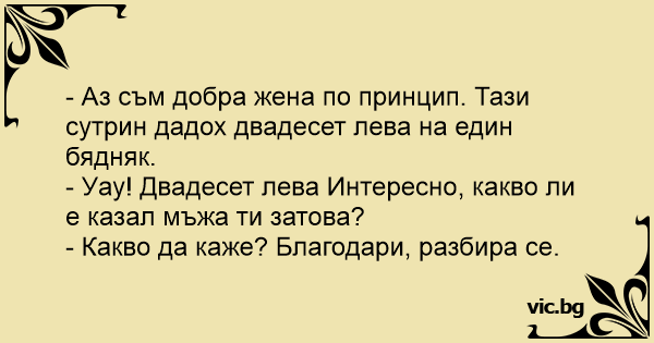 - Аз съм добра жена по принцип. Тази сутрин дадох двадесет лева на един бядняк.