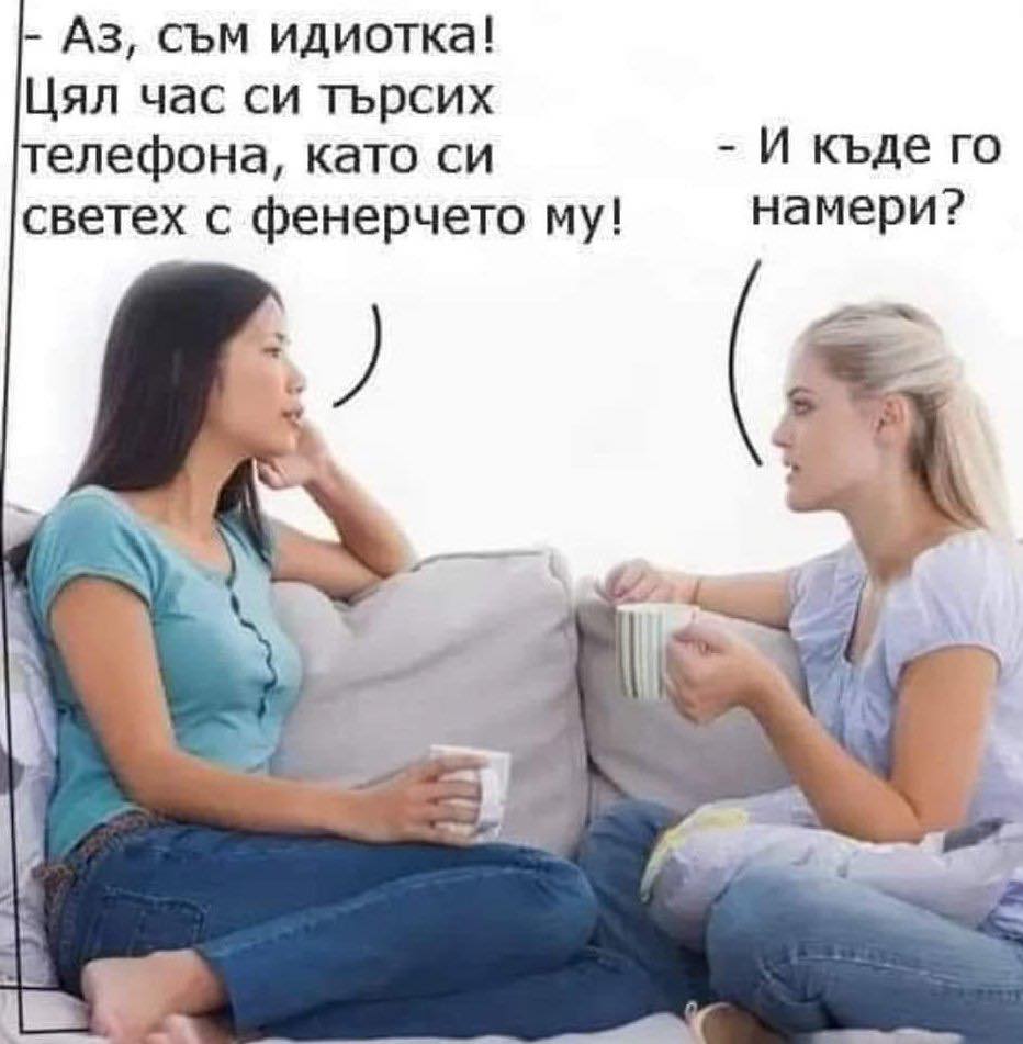 - Аз съм идиотка! Цял час си търсих телефона, като си светих с фенерчето му! - И къде го намери?