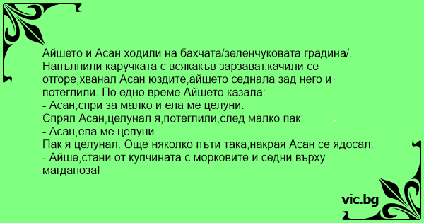 Напълнили каручката с всякакъв зарзават,качили се отгоре,хванал Асан юздите,айшето седнала зад него и потеглили. По едно време Айшето казала: