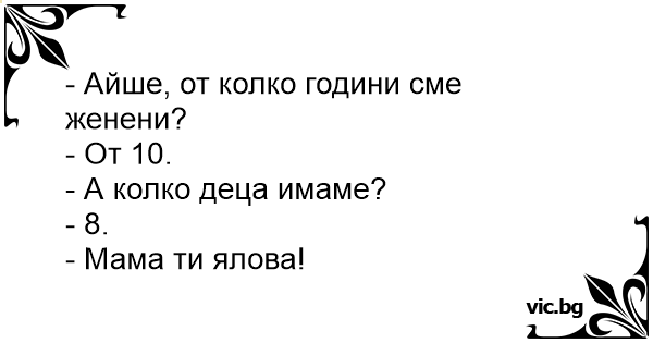 - Айше, от колко години сме женени?<br />- От 10.<br />- А колко деца имаме?<br />- 8.<br />- Мама ти ялова!