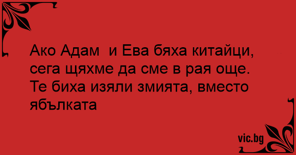 Заклучок на еден истражувач за историјата на човечкиот род: - Да беа Кинези Адам и Ева, нашата историја би била сосема поинаква. - Би го оставиле јаболкото да виси на гранка, a би ја изеле змијата.
