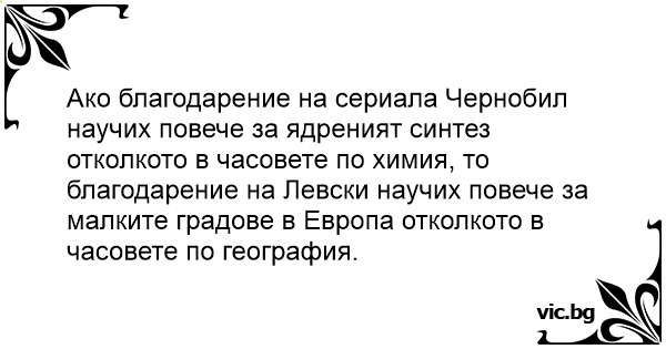 Ако благодарение на сериала Чернобил научих повече за ядреният синтез отколкото в часовете по химия, то благодарение на Левски научих повече за малките градове в Европа отколкото в часовете по география.