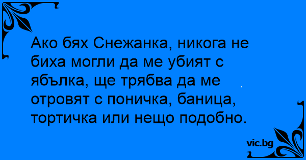 Ако бях Снежанка, никога не биха могли да ме убият с ябълка, ще трябва да ме отровят с поничка, баница, тортичка или нещо подобно.