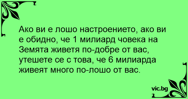 Ако ви е лошо настроението, ако ви е обидно, че 1 милиард човека на Земята живетя по-добре от вас, утешете се с това, че 6 милиарда живеят много по-лошо от вас.