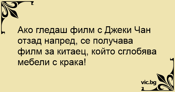 Ако гледаш филм с Джеки Чан отзад напред, се получава филм за китаец, който сглобява мебели с крака!