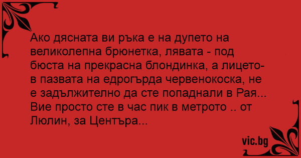 Ако дясната ви ръка е на дупeto на великолепна брюнетка, лявата - под бюста на прекрасна блондинка, а лицето- в пазвата на едрогърда червенокоска, не е задължително да сте попаднали в Рая...