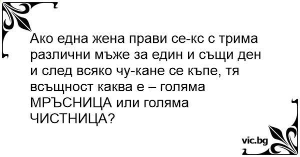 Ако една жена прави cekc с трима различни мъже за един и същи ден и след всяко чуkaнe се къпе, тя всъщност каква е – голяма МРЪСНИЦА или голяма ЧИСТНИЦА?