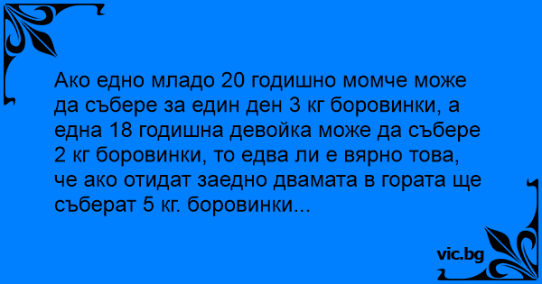 Ако едно младо 20 годишно момче може да събере за един ден 3 кг боровинки, а една 18 годишна девойка може да събере 2 кг боровинки, то едва ли е вярно това, че ако отидат заедно двамата в гората ще съберат 5 кг. боровинки...
