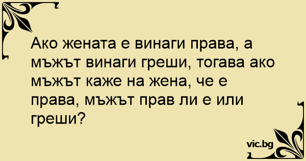 Ако жената е винаги права, а мъжът винаги греши, тогава ако мъжът каже на жена, че е права, мъжът прав ли е или греши?