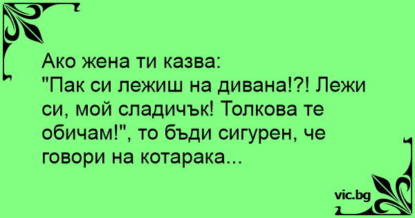 "Пак си лежиш на дивана!?! Лежи си, мой сладичък! Толкова те обичам!", то бъди сигурен, че говори на котарака...