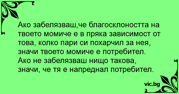 Ако забелязваш,че благосклоността на твоето момиче е в пряка зависимост от това, колко пари си похарчил за нея, значи твоето момиче е потребител.