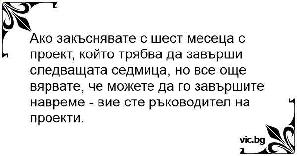 Ако закъснявате с шест месеца с проект, който трябва да завърши следващата седмица, но все още вярвате, че можете да го завършите навреме - вие сте ръководител на проекти.
