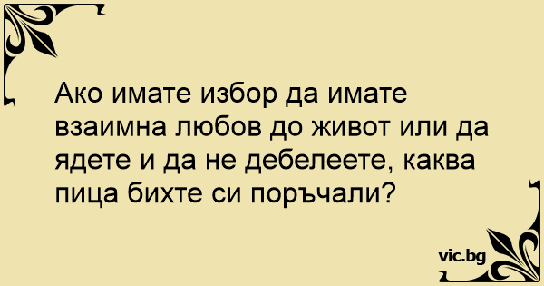 Ако имате избор да имате взаимна любов до живот или да ядете и да не дебелеете, каква пица бихте си поръчали?