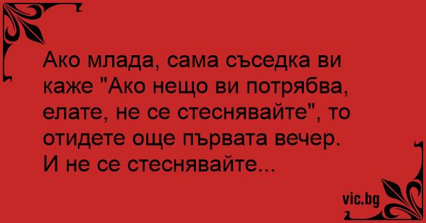Ако млада, сама съседка ви каже "Ако нещо ви потрябва, елате, не се стеснявайте", то отидете още първата вечер.