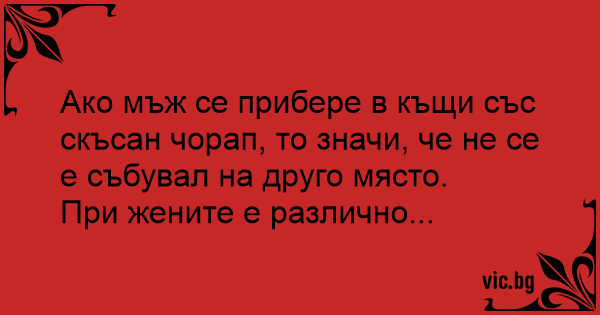 Ако мъж се прибере в къщи със скъсан чорап, то значи, че не се е събувал на друго място.