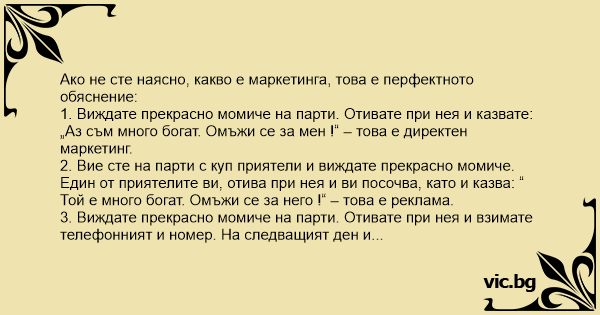 6. Виждате прекрасно момиче на парти. Отивате при нея и казвате: “ Аз съм много богат. Омъжи се за мен !“ Тя без да се замисли, ви удря здрав шамар ! – това е обратна връзка с клиентите.
