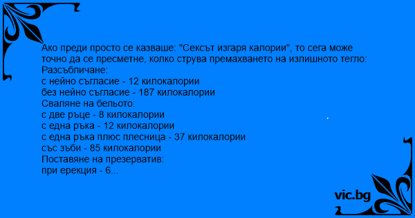 Ако преди просто се казваше: "Cekcъt изгаря калории", то сега може точно да се пресметне, колко струва премахването на излишното тегло: