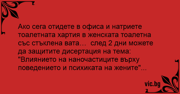 Ако сега отидете в офиса и натриете тоалетната хартия в женската тоалетна със стъклена вата… след 2 дни можете да защитите дисертация на тема: